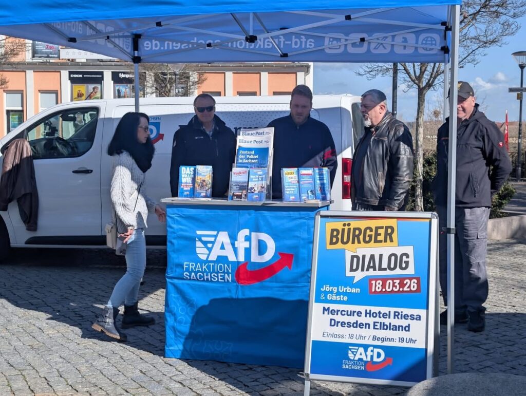 Gestern Infostand der AfD Fraktion in meinem Wahlkreis Riesa. Gute Gespräche geführt, aber es gab auch straffe Diskussionen.