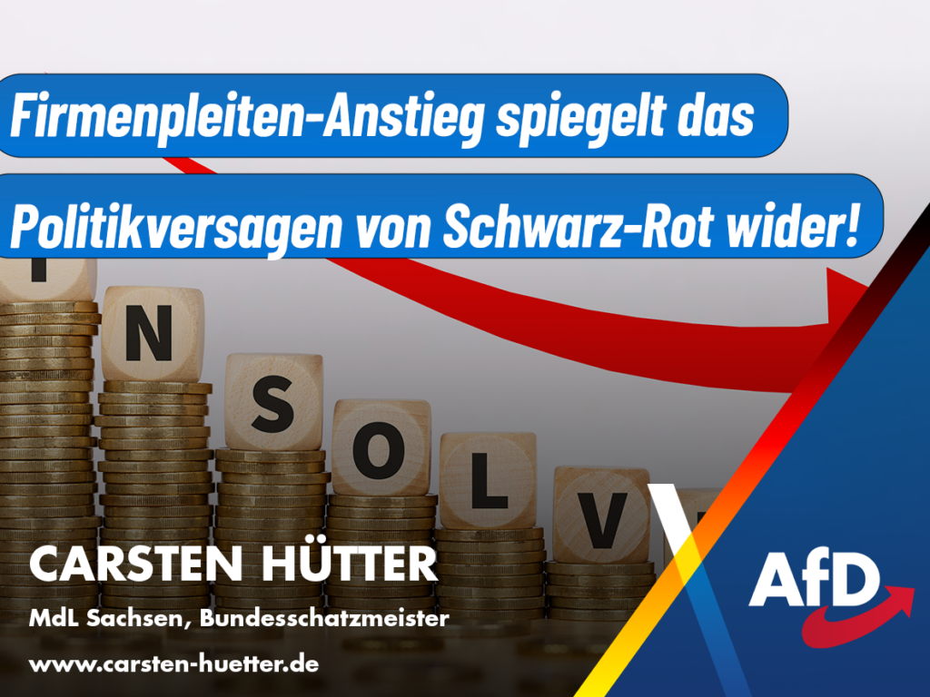 „Eine Welle von Firmenpleiten frisst sich durch Sachsen. Diese verheerende Entwicklung spiegelt in brachialer Weise das Politikversagen von CDU und SPD wider! Wir als AfD haben lange vor dem ideologiegetriebenen Wirtschaftskurs auf Bundes- und Landesebene gewarnt. Wie auch bei unseren Warnungen zur Masseneinwanderung sind wir dafür von vielen Seiten angegriffen, verspottet oder im besten Fall belächelt worden. Jetzt bewahrheiten sich unsere Prognosen einmal mehr – und viele werden plötzlich sehr kleinlaut.